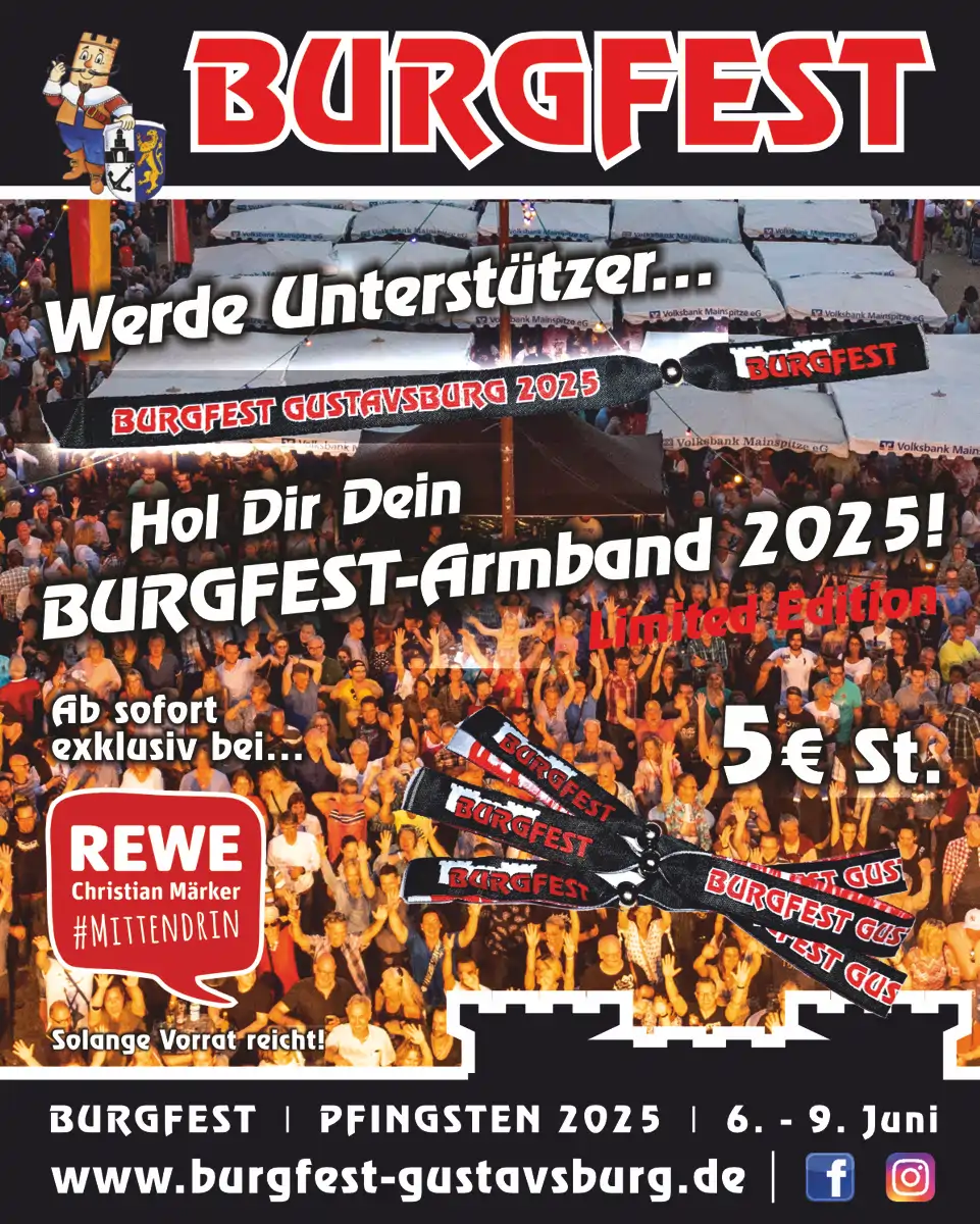 Nur an bestimmten Stellen erhältlich! Im Vorfeld des Burgfestes wird das Festivalbändchen exklusiv im Gustavsburger REWE Markt Christian Märker erhältlich sein, und während des Burgfestes auf dem Festplatz direkt an allen Bier- und Weinständen – nur solange der Vorrat reicht.